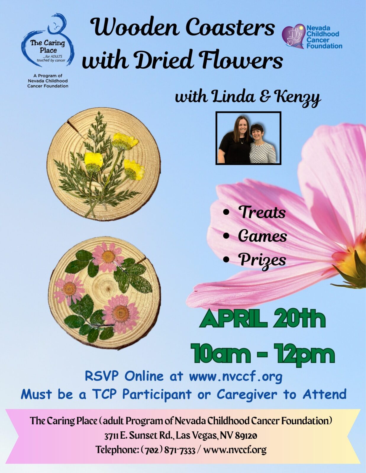 Join Kenzy and Linda for 2 hours of creating Wooden Coasters with Dried Flowers while enjoying Games, Treats and Prizes. MUST RSVP Online! Attendees must be a registered TCP Participants OR Caregiver.