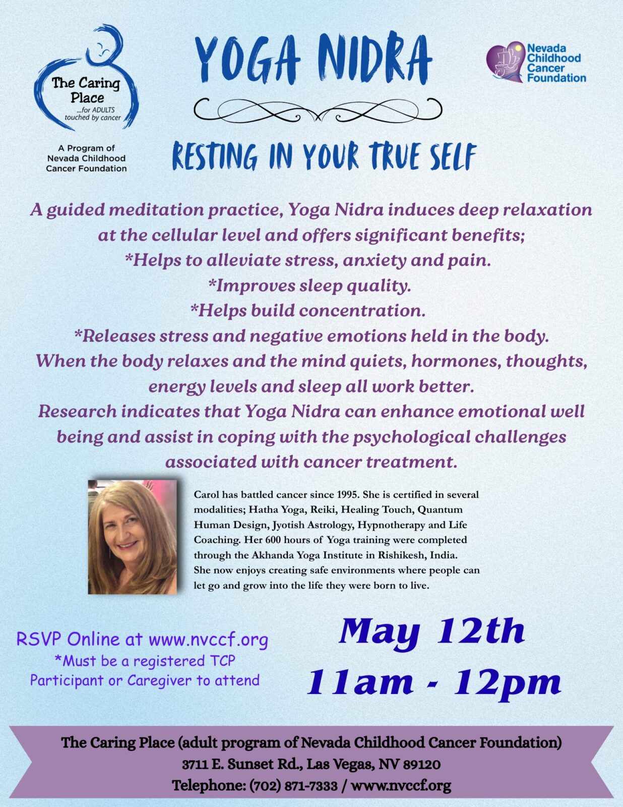 Join Carol Kramer for Yoga Nidra...a guided meditation practice, which induces deep relaxation and offers many other significant benefits. MUST RSVP Online or call 702-871-7333. Attendees must be registered TCP Participants or Caregivers.