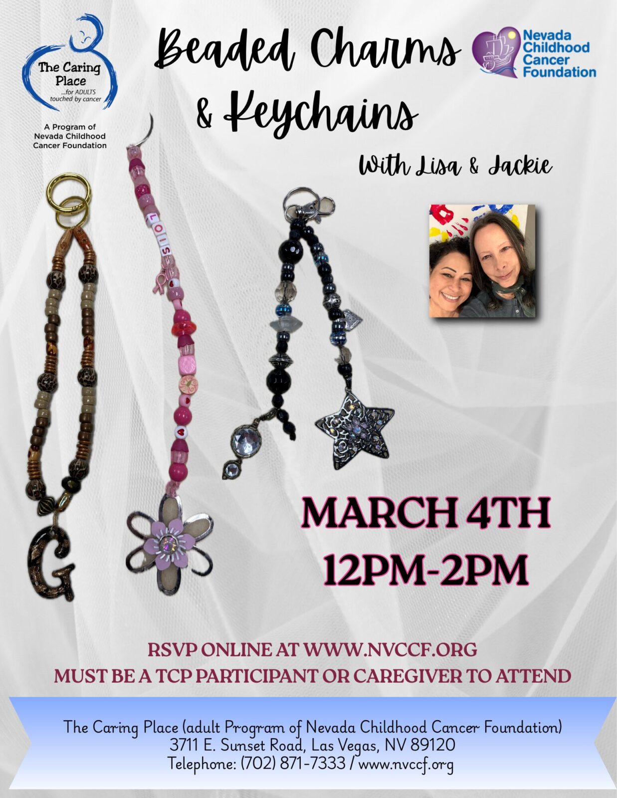 The Caring Place 3711 E Sunset Rd, Las Vegas, NV, United StatesJoin Jackie & Lisa for 2 hours of fun making beaded charms and keychains!