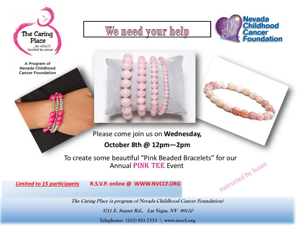 We need your help! So please come join us to create some beautiful “Pink Beaded Bracelets” for our Annual Pink Tee Event.