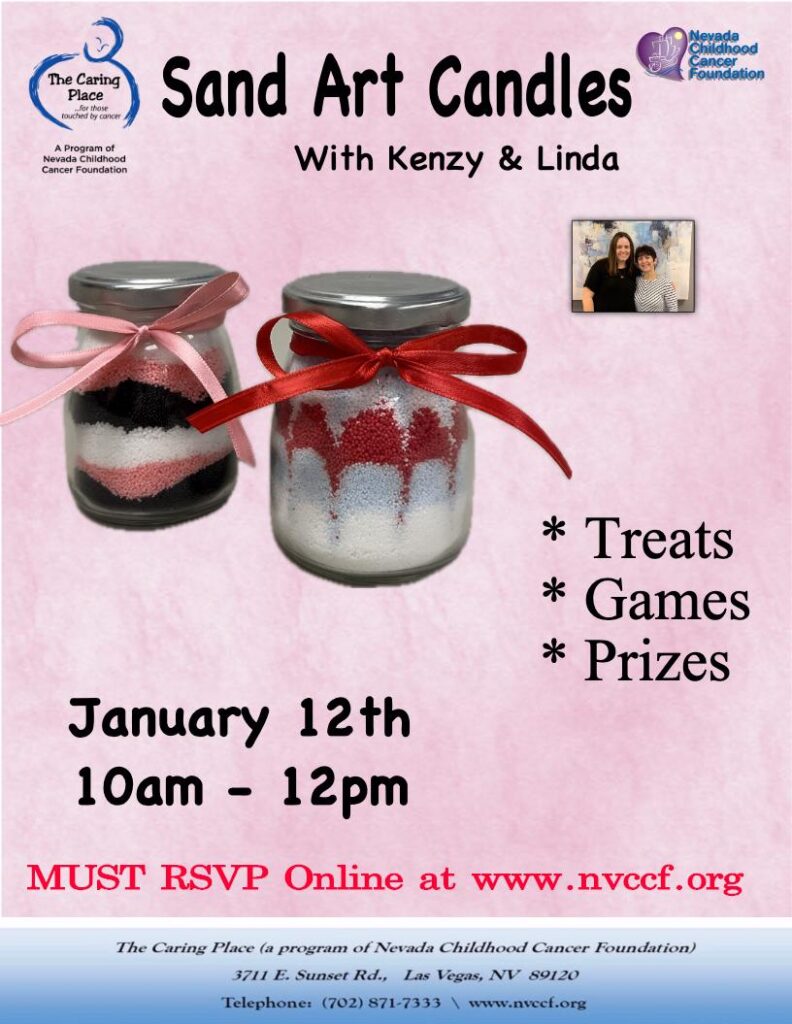 Join Kenzy and Linda for 2 hours of creating Sand Art Candles while enjoying Games, Treats and Prizes. MUST RSVP Online! Attendees must be a registered TCP Participants.